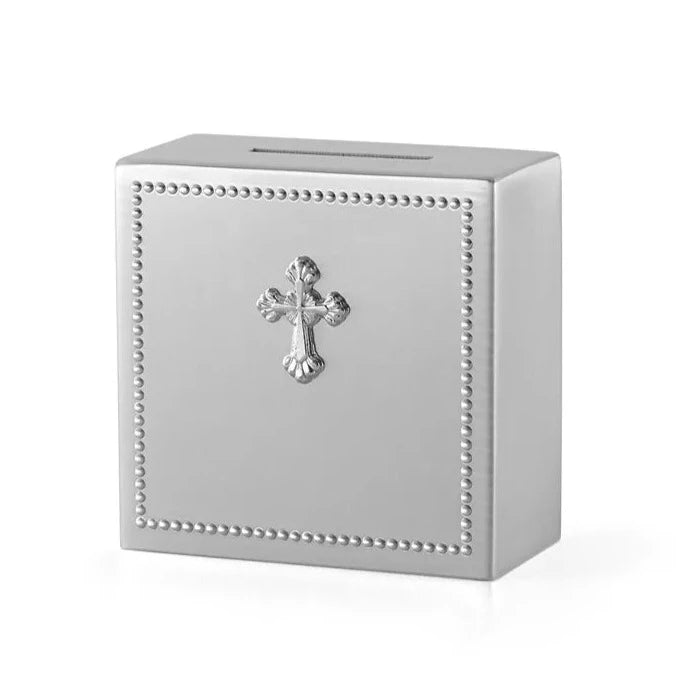 Inspired by the European abbeys' ornate designs the silver-plated Abbey Bank features a cross at its center and makes a great gift for any religious event. Part of the Abbey Collection.