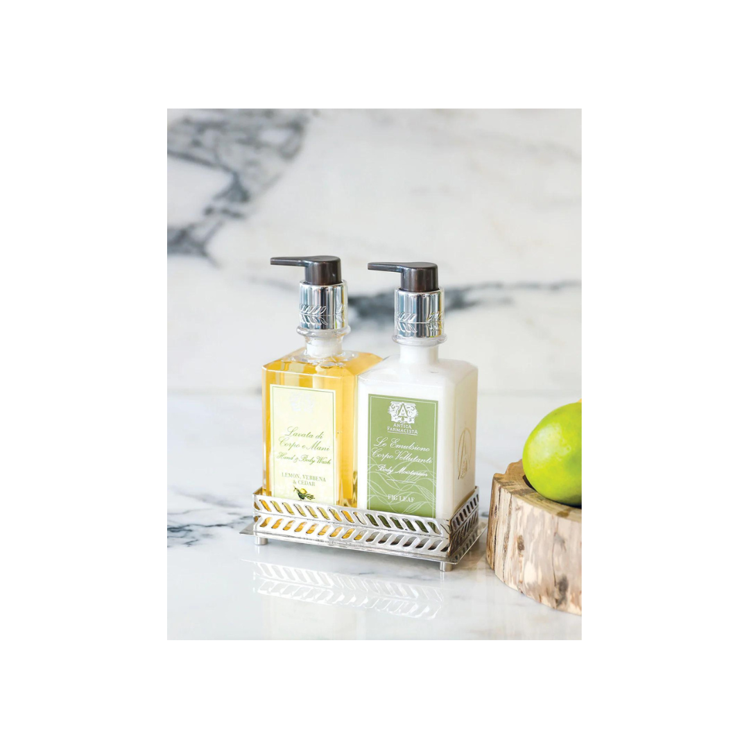 THE PRODUCT: Our Bath & Body Tray is made to perfectly hold two 10oz Antica Bath & Body products. Our luxuriously detailed nickel-plated trays are the perfect accompaniment for your Antica home ambiance and bath and body products. A polished look ideal for a powder room, kitchen or any refined space in your home