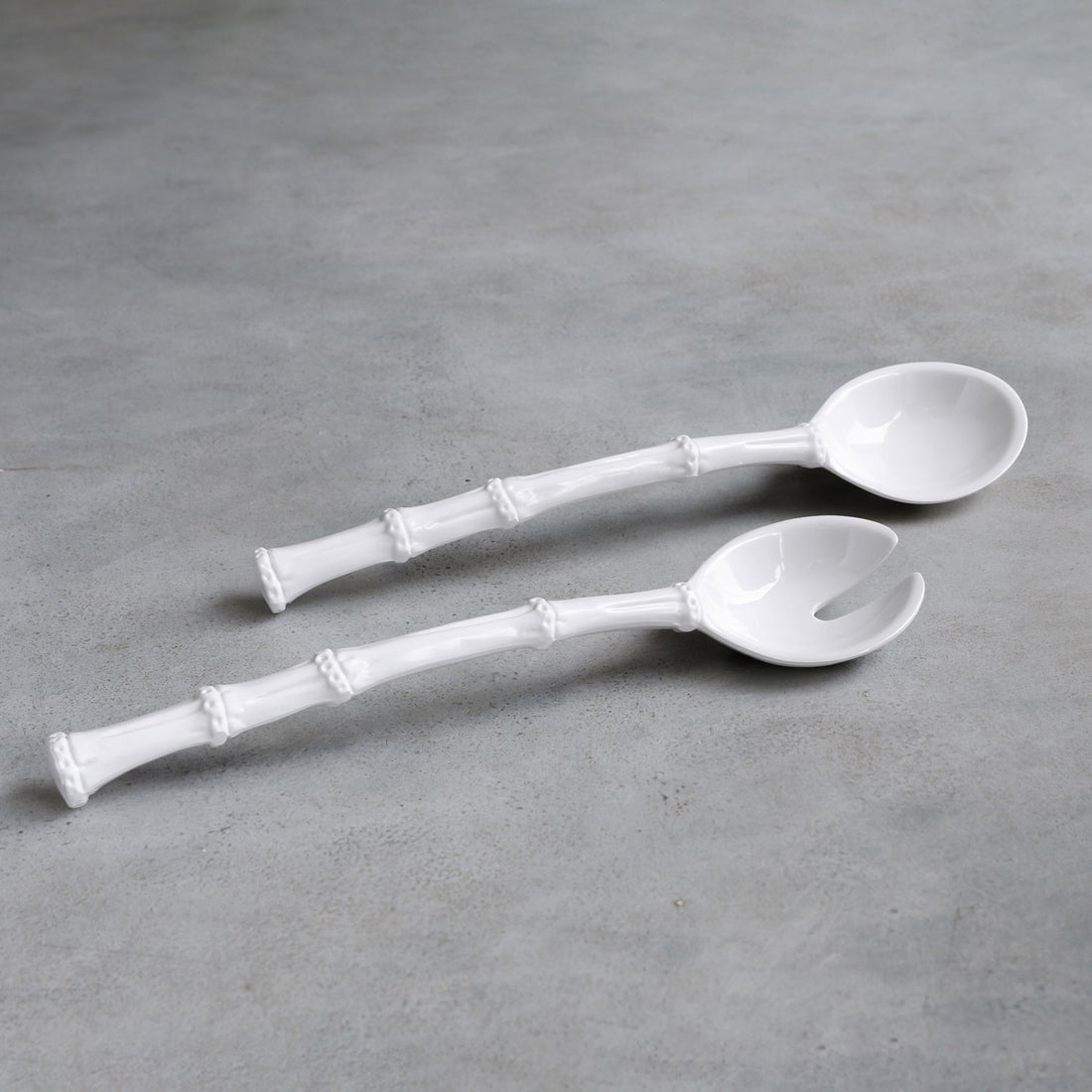 Brilliant faux bamboo styling presented in luxury melamine. With naturalistic bamboo inspired handles, these dazzling white salad servers are a great addition to any bowl. A natural when paired with Beatriz Ball's VIDA bowls. A great gift for the foodie in your life. Dishwasher safe (top rack), heavy weight, break resistant and durable, food safe, BPA and PABA free.