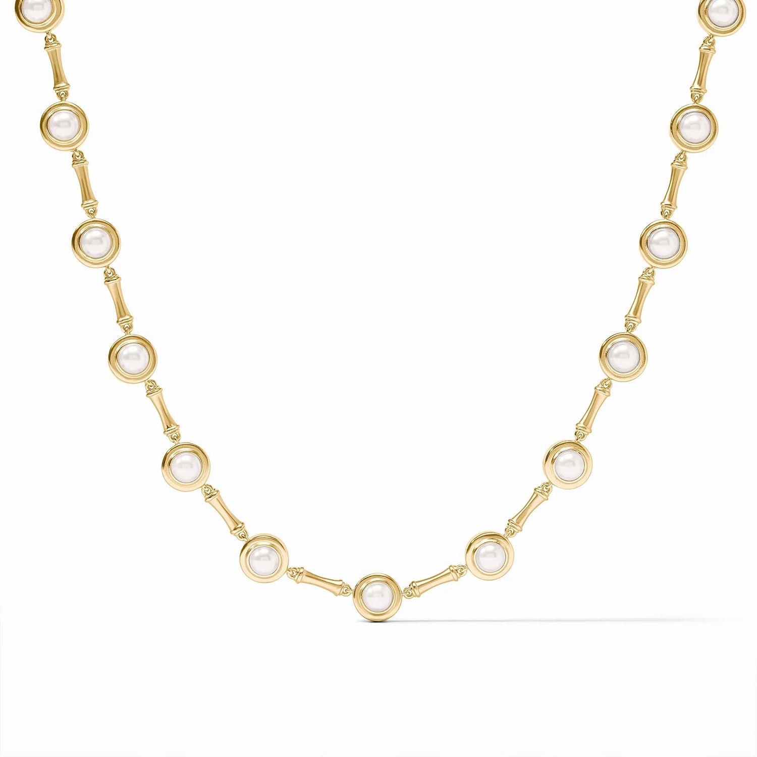 This necklace marries two ancient symbols of longevity and success, with round pearls emerging from lightly burnished settings, linked by petite lengths of golden bamboo and closing with an adjustable bamboo toggle.
