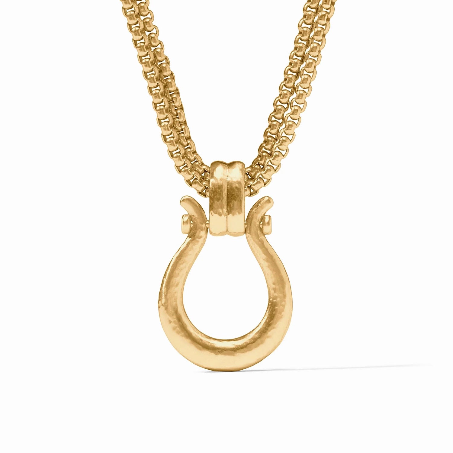 It's off to the races in this necklace's lightly hammered golden bridle ring pendant, which sways from a doubled Venetian box chain that closes with a yoke-shaped toggle.
