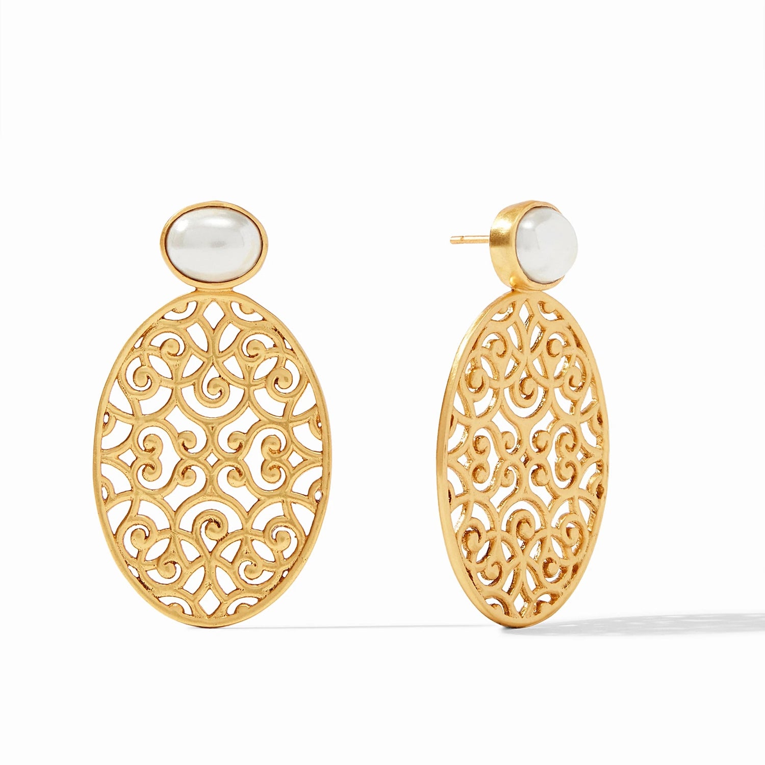 An ornate oval-shaped statement earring with a gilded lacy openwork is suspended from a sparkling, round rose-cut gemstone of imported glass.
