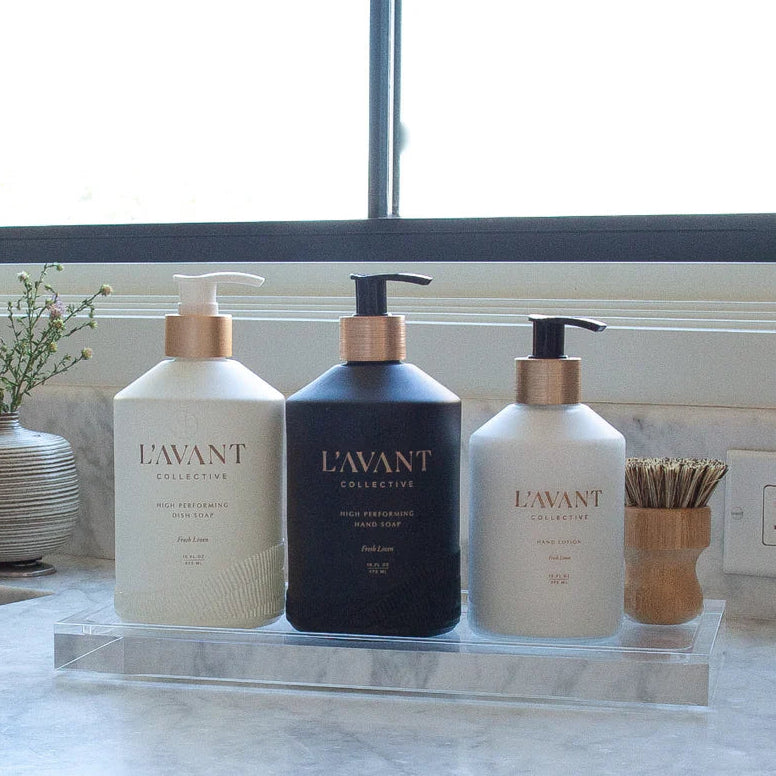 Complete the look of L’AVANT by nestling your products in their own custom tray made from sparkling clear lucite acrylic. Compatible with any décor, these luxe lovelies blend seamlessly into their surroundings with a minimalist design for ultimate versatility. Finely constructed with thick sides and base for durability and stability.